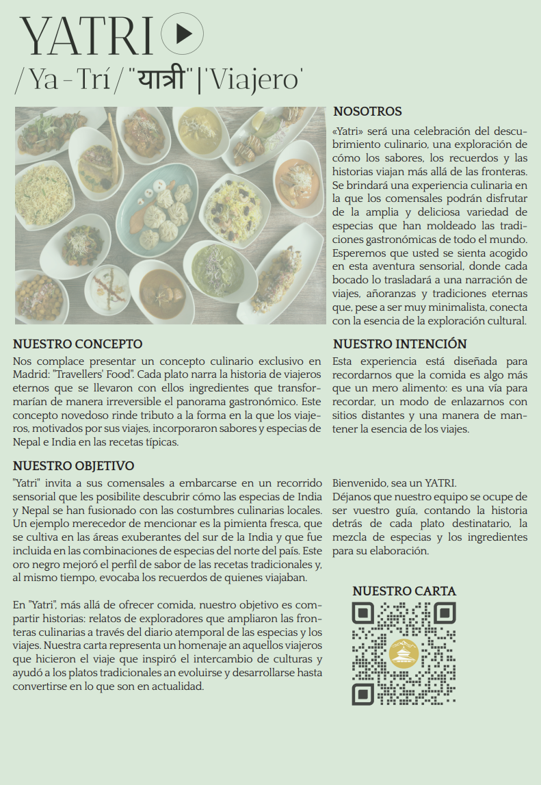 Estamos encantados de presentar un concepto gastronómico exclusivo, "Comida de Viajeros", en el que cada plato cuenta la historia de viajeros atemporales que se aventuraron a tierras lejanas y trajeron de regreso ingredientes que cambiarían para siempre el panorama culinario. Este concepto innovador celebra cómo los viajeros, inspirados por sus viajes, introdujeron especias y sabores de la India y Nepal en recetas tradicionales. Nuestro menú es un homenaje al intercambio de culturas, donde los aromas de las especias crean una sensación de nostalgia, transportando a los huéspedes a los destinos que los inspiraron.